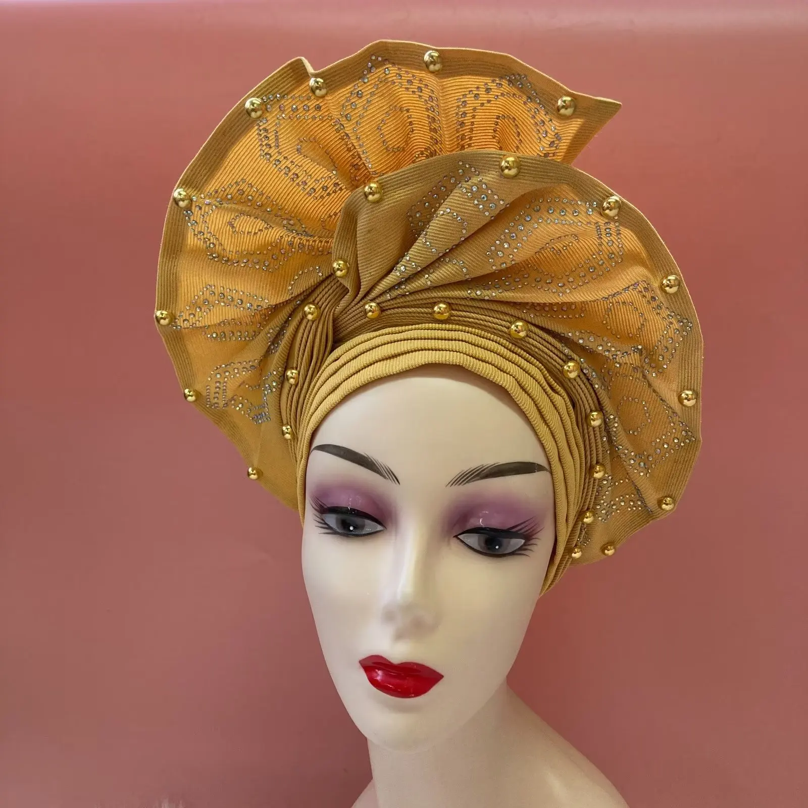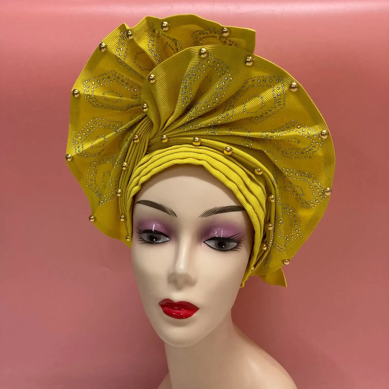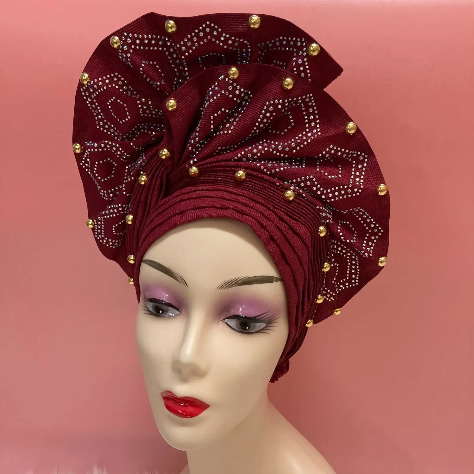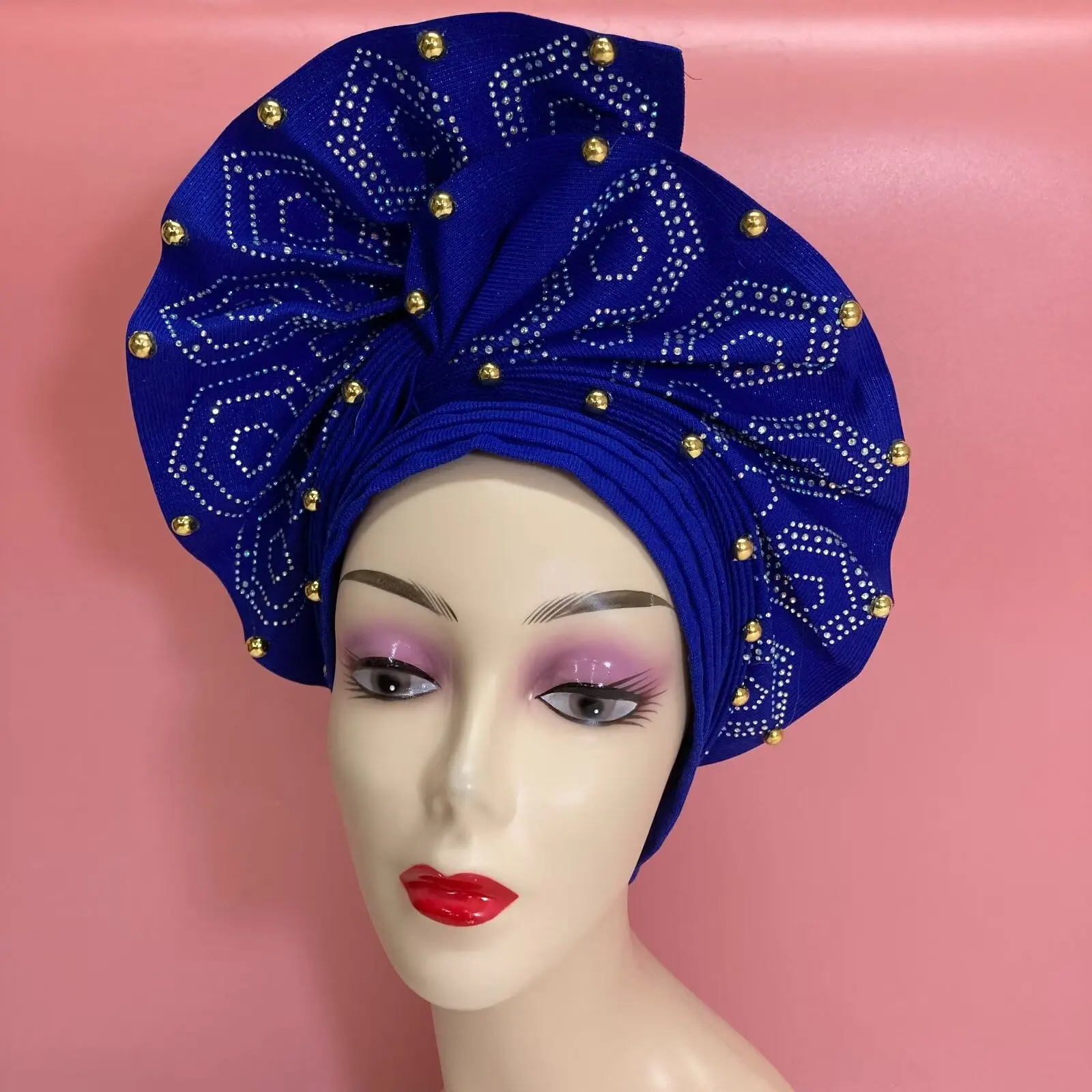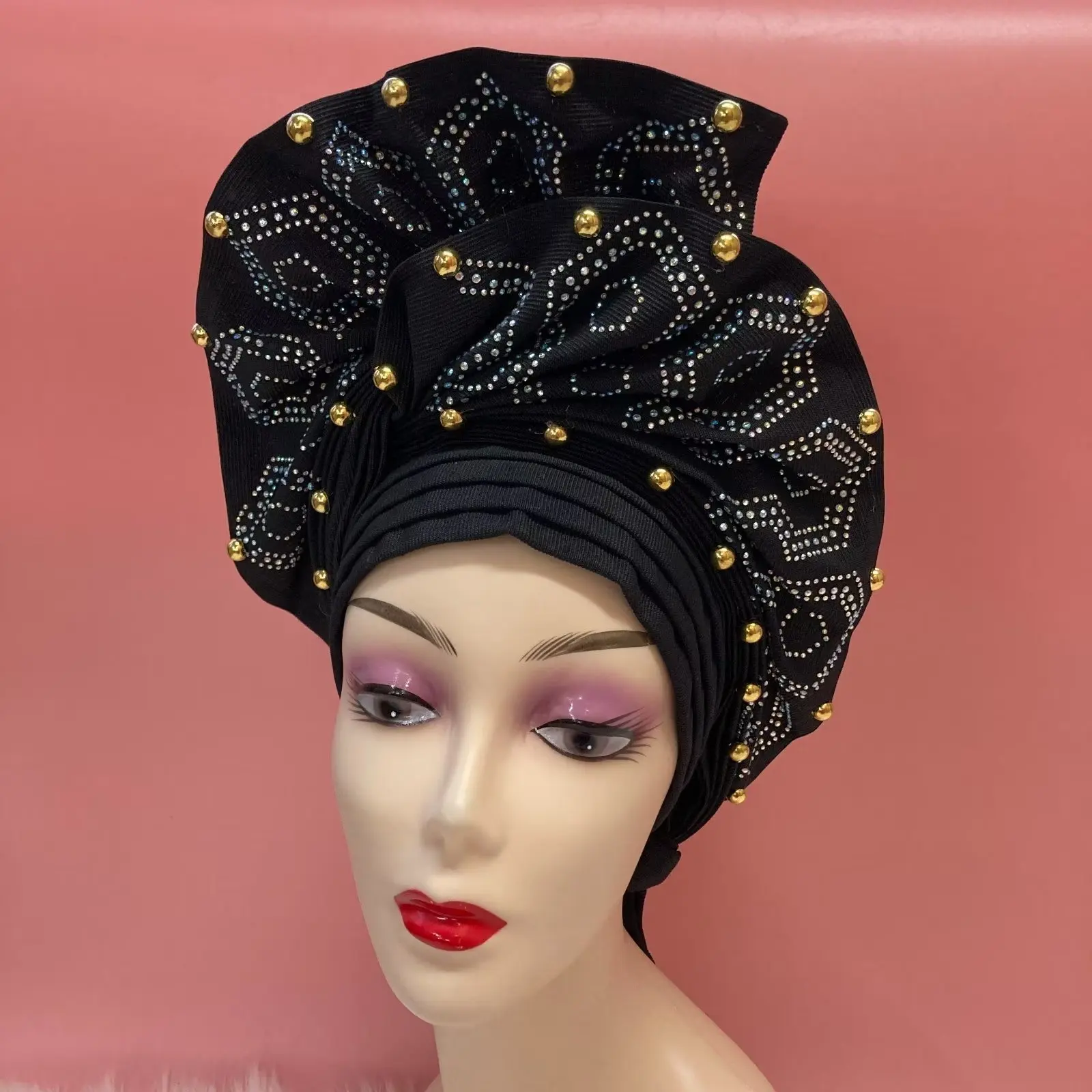 Fahion High Quality Nigerian Gele Headtie Aso Oke Gele Already Made Auto Gele Aso Ebi Headtie African Turban with Bead Z1113-1