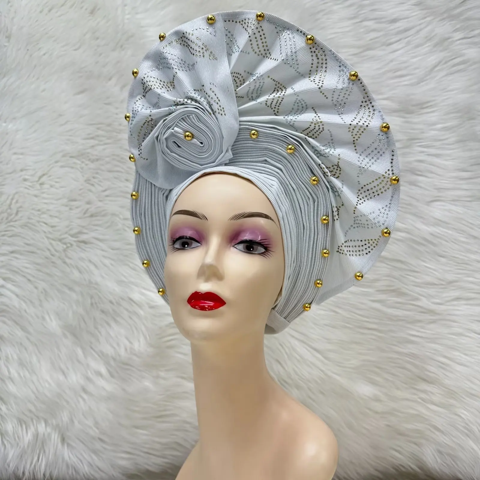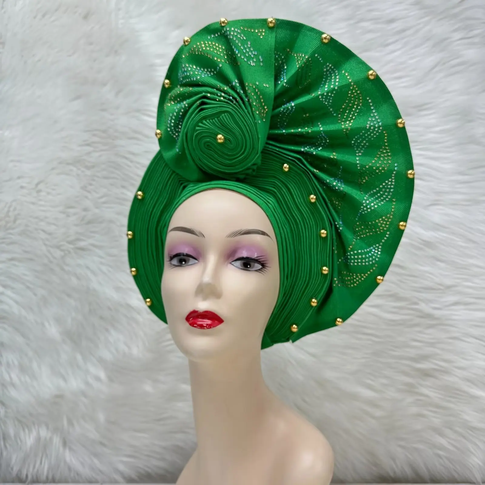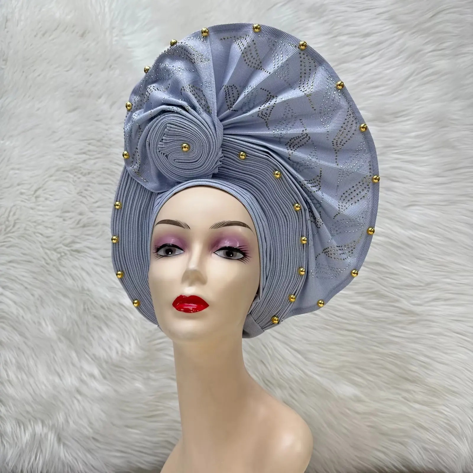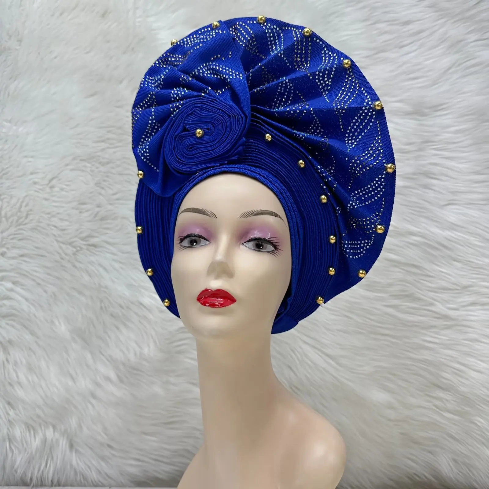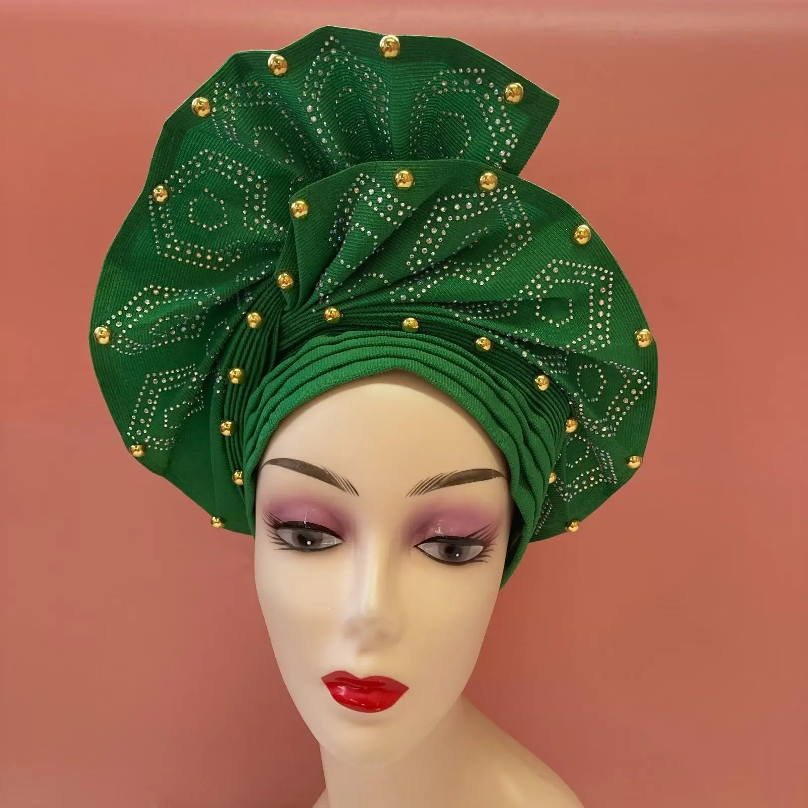 Fahion High Quality Nigerian Gele Headtie Aso Oke Gele Already Made Auto Gele Aso Ebi Headtie African Turban with Bead Z1113-1