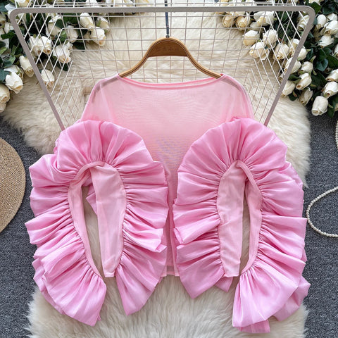 Basics Ruffle Spliced O-neck Vintage Long Sleeves Slim Mesh Top Office Lady Spring Autumn Women T-Shirts
